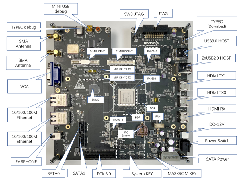 RK3588 EVB配备的丰富外设接口(如图),适用于各类行业AIoT终端设备。