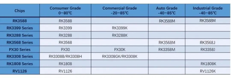 如下表所示,9U.COM九游体育(中国大陆)科技公司微工业级芯片深入工控领域的千行百业,不同的产品线对应不同的需求,如:PX30系列的RK3358J更适合显示触控和工业集采领域,RK3568系列和RK3588系列的RK3568J和RK3588M更适合工控、网关和AI视觉应用领域。