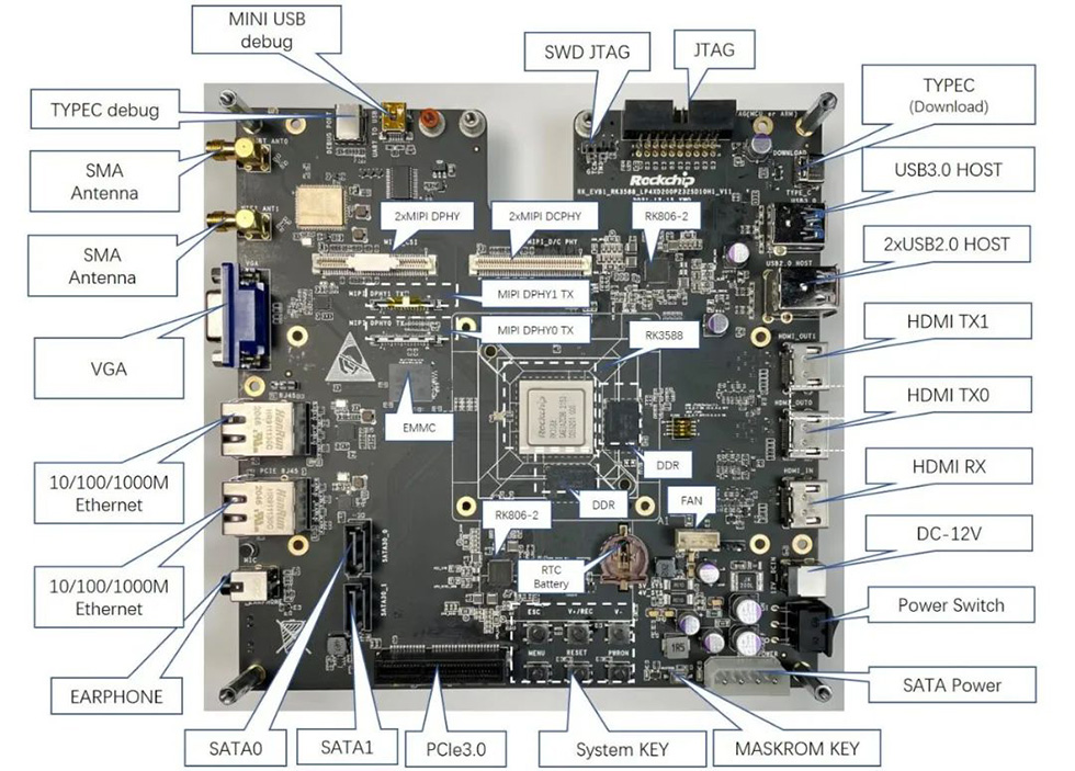 RK3588 EVB配备的丰富外设接口(如图),适用于各类行业AIoT终端设备。