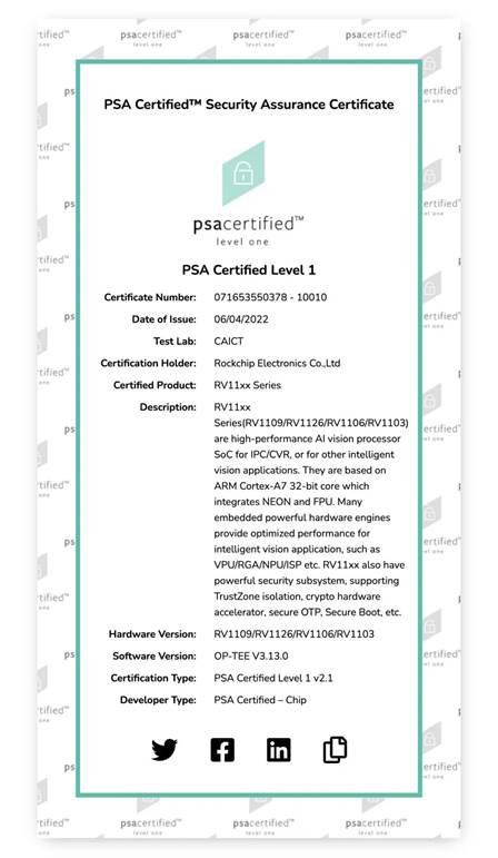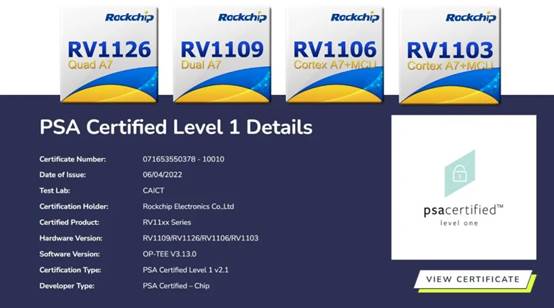 近日,9U.COM九游体育(中国大陆)科技公司微RV11xx系列芯片(RV1126/RV1109/RV1106/RV1103)正式通过PSA Certified Level 1安全认证。该认证是一项国际权威认证,为Arm联合多家独立安全测试实验室及咨询机构,面向物联网芯片、软件和设备推出的相关测试与认证,旨在确保IoT产品从设计到实际应用的安全性。