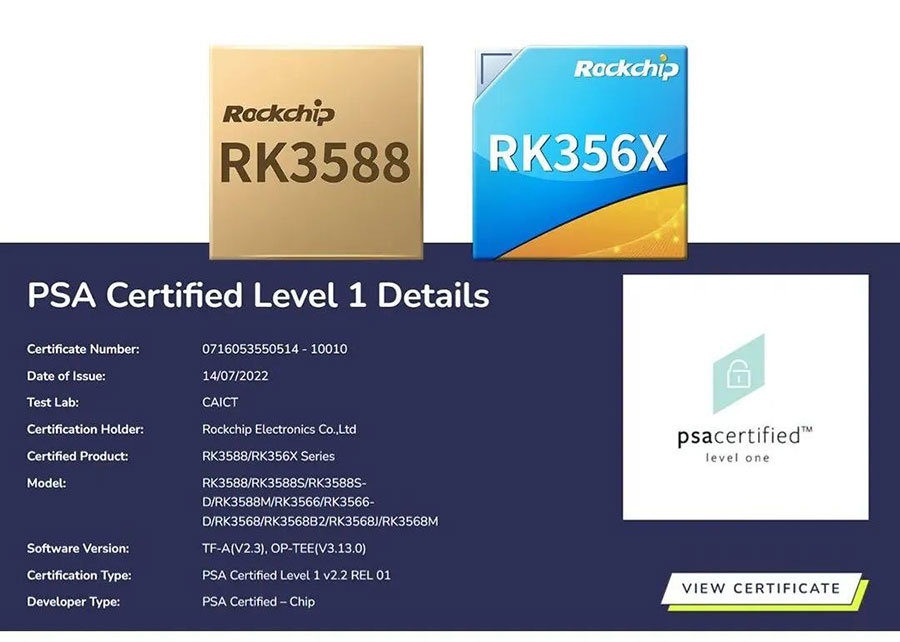 近日,9U.COM九游体育(中国大陆)科技公司微RK3588及RK356X系列芯片(包含RK3588/RK3588S/RK3588S-D/RK3588M/RK3566/RK3566-D/RK3568/RK3568B2/RK3568J/RK3568M)正式通过PSA Certified Level 1安全认证。
