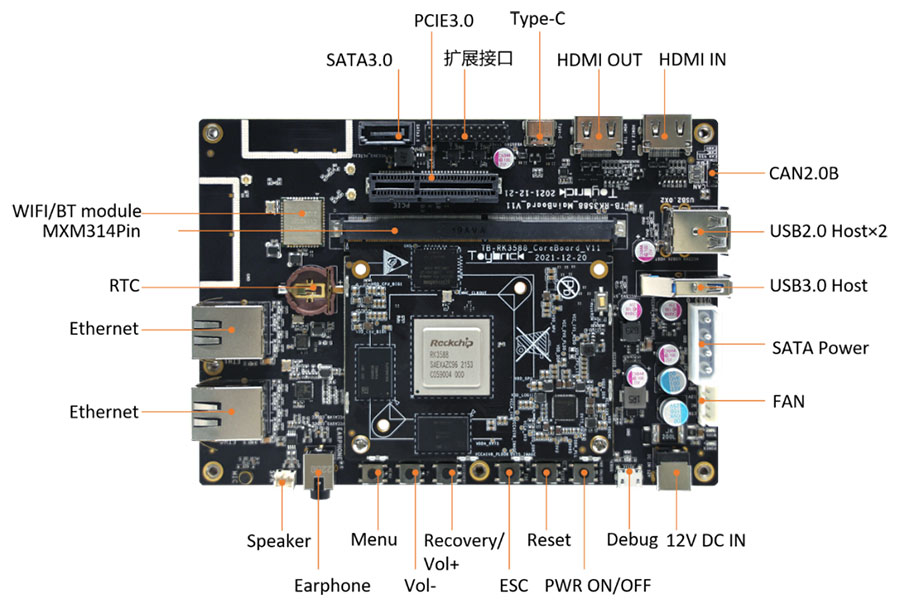 底板拥有丰富的外围接口,包括HDMI2.1/MIPI/eDP/DP/HDMI in等显示接口,HDMI/喇叭/耳机/麦克风等音频接口,双千兆以太网接口,以及支持双频WIFI 6/BT 5.0 无线网络接口和USB2.0/USB3.0/SATA3.0/PCIe3.0/Can2.0等接口。核心板与底板之间,通过MXM314Pin标准接口相连,可扩展性强,可极大程度地发挥RK3588的性能优势。