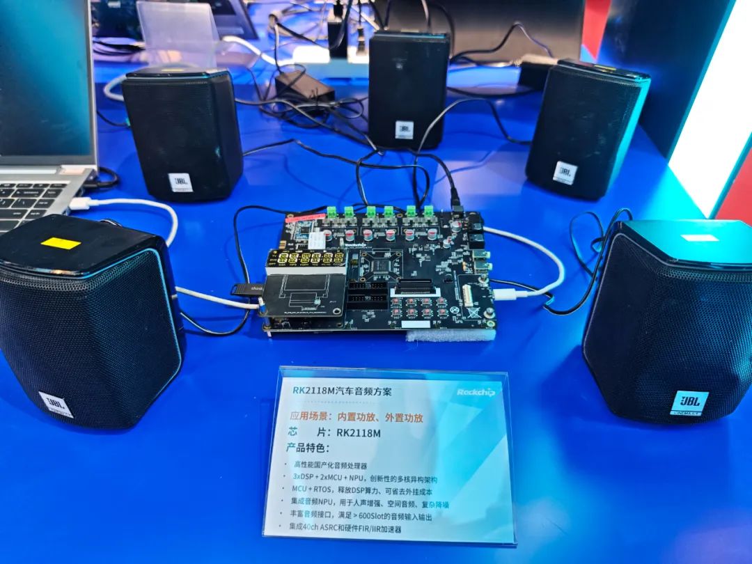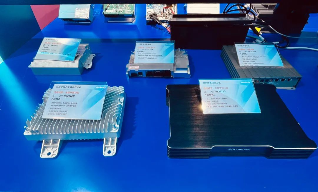 现场展出了数款基于RK2118M的外置功放产品,已在多个主流新能源汽车品牌落地商用。基于高算力的功放架构,RK2118M支持搭载超过20个以上的扬声器,并可以同时支持运行环绕音效、主动声浪,主动降噪等中高阶音效算法。