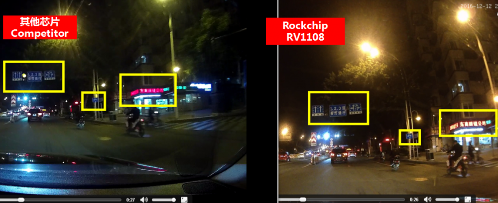 The images in red frame show the significantly difference in the video. Under the strong daylight, the image of competitor on the left obviously reflects the light and disappears the building, while RV1108 well-disposes the image exposure and clearly shows the building, hence highlighting the excellent WDR performance.